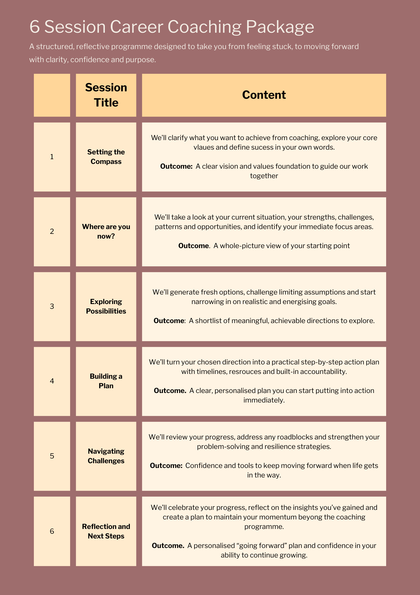 This six-session career coaching package provides a structured, supportive journey from reflection to action. Together, we’ll explore your current situation, generate new possibilities, and turn insight into a practical, personalised plan. Along the way, we’ll work through confidence, decision-making, and any barriers that have been holding you back. By the end of the programme, you’ll have greater clarity, renewed momentum, and a clear sense of direction you can carry forward with confidence.